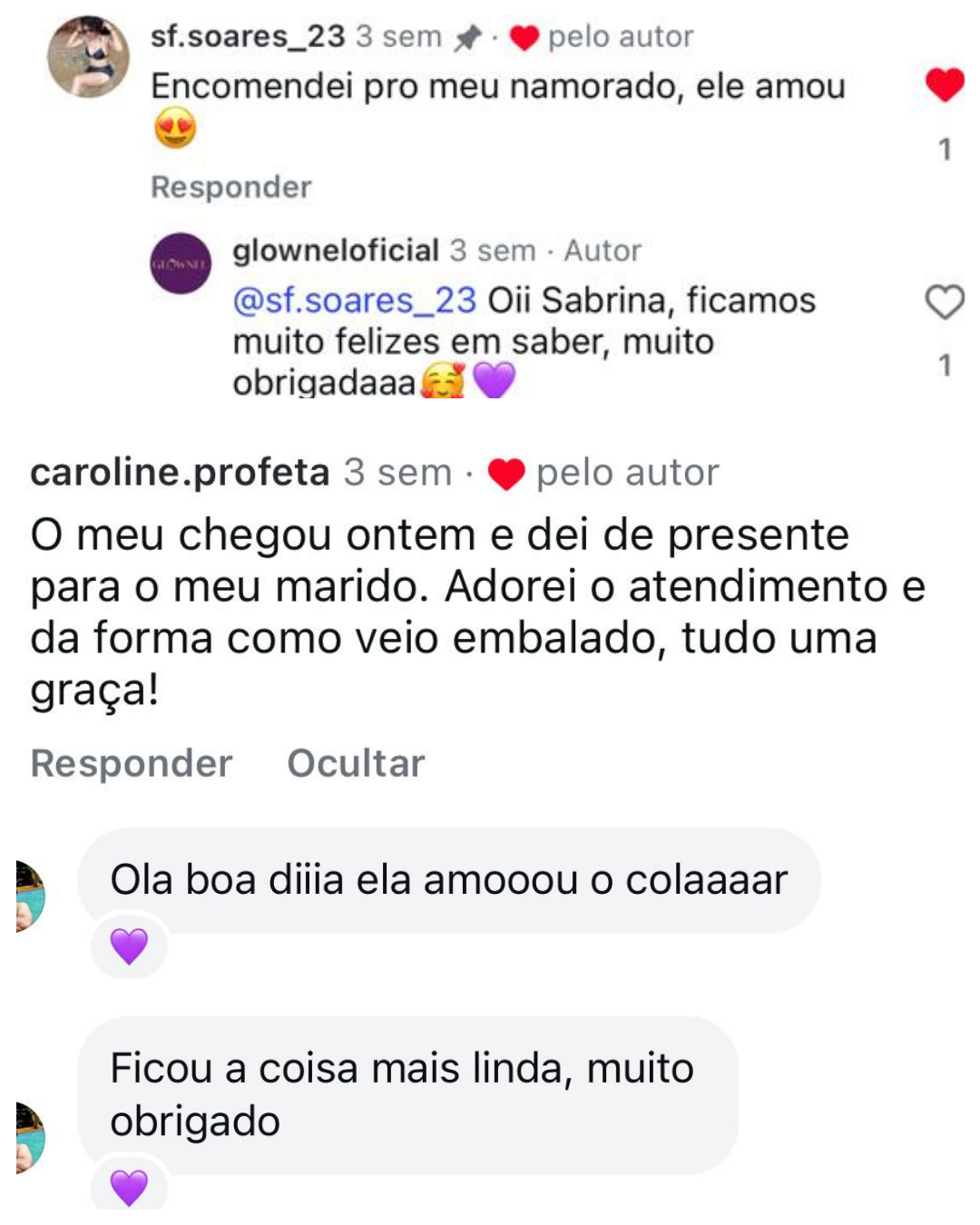 Esses são alguns depoimentos enviados por clientes Glownel através do WhatsApp, Instagram e outros canais.